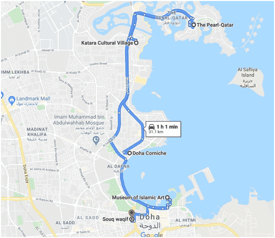 Corniche: Is a waterfront promenade extending for seven kilometres along Doha Bay and It is a popular tourist and leisure attraction within Qatar.